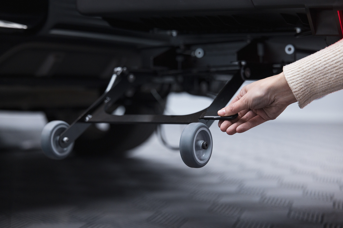- sistem de roți pliabile pentru montarea ușoară pe bara de remorcare și mutarea suportului în afara vehiculului
