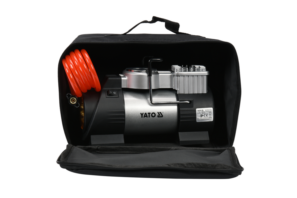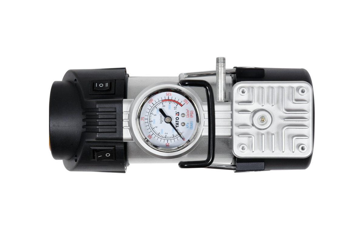 - Compresorul auto YATO YT-73460 de 12V poate umfla anvelope de mașină și bicicletă, precum și saltele și mingi. Manometrul încorporat facilitează verificarea presiunii, iar lumina LED permite o funcționare confortabilă chiar și după lăsarea întunericului.